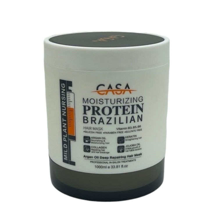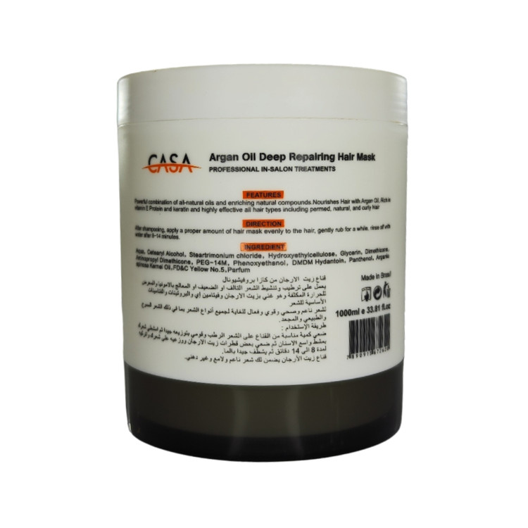ماسک مو برند کاسا حجم ۱۰۰۰ میلی لیتر، ساخت برزیل، حاوی روغن آرگان، جوجوبا، کلاژن، کراتین و ویتامینهای B3,B5,B6 برای آبرسانی، تثبیت رنگ مو و صافی مو. مناسب انواع مو و قابل استفاده پس از کراتینتراپی.