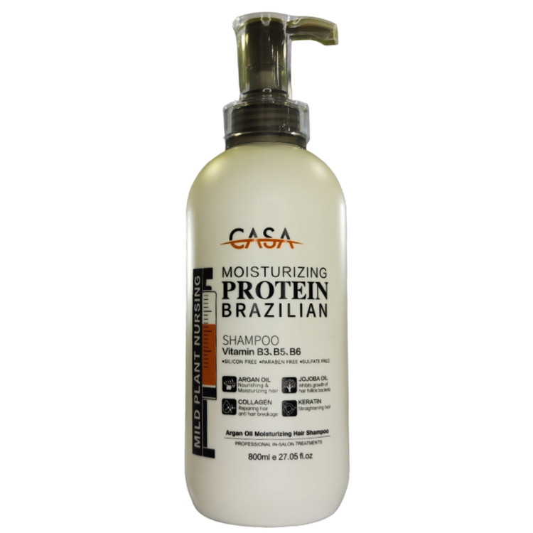 شامپو برند کاسا حجم 8۰۰ میلی لیتر ساخت برزیل، بدون سولفات و حاوی کراتین، کلاژن، روغن آرگان، ویتامینهای B3,B5,B6. مناسب برای تثبیت کراتین، رنگ و ترمیم موهای آسیبدیده. حجم ۸۰۰ میلی لیتر